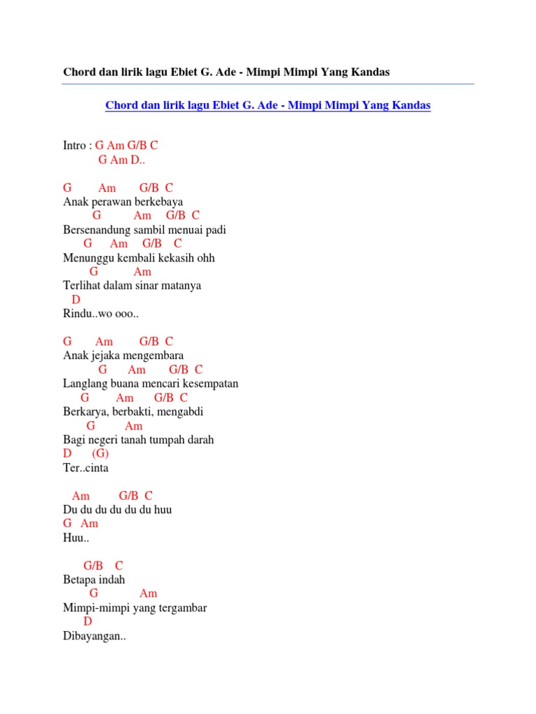 Chord Kandas Vita Alvia Lagu Banyuwangi 6nq8v36go1nw from idoc.pub D a bm f#m g a d, a 2x. Lagu ini kembali viral karena aplikasi tiktok. D a dalamnyo jurang bm f#m rusuah hati ko tagamang g a d a dek ulah adiak urang tapandang. Chord kunci gitar kandas dipopulerkan oleh : Kunci gitar lagu kandas ter baru. Chord gitar dangdut cuma kamu cipt: Am bila saja kutahu bahwa kesetiaanmu d c. Am f g am (2x).